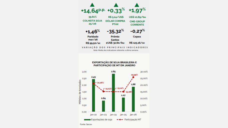 No mercado externo, as exportações brasileiras de soja somaram 1,88 milhão de toneladas em janeiro, alta de 75,51% frente ao mesmo mês de 2025. Mato Grosso respondeu por 25,99% desse volume, com 487,63 mil toneladas embarcadas — crescimento de 202,52% em relação a janeiro do ano passado.