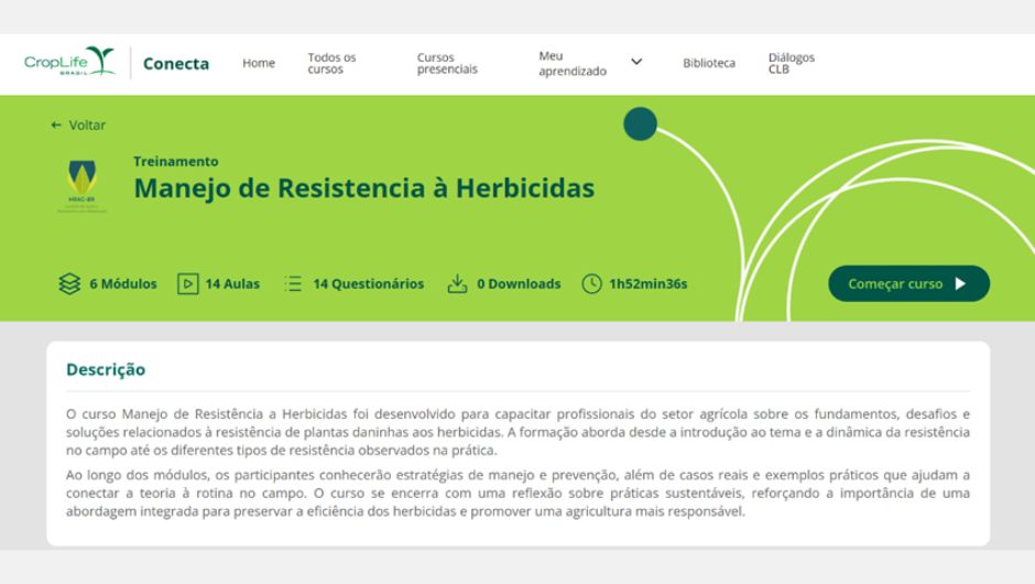 Um novo curso voltado ao Manejo de Resistência no campo está disponível na plataforma educacional CropLife Conecta. A capacitação é ofertada de forma gratuita e on-line pela CropLife Brasil e o Comitê de Ação à Resistência de Plantas Daninhas aos Herbicidas (HRAC-BR), e prevê a apresentação de protocolos e orientações inéditas a produtores.