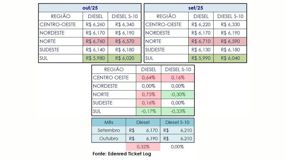 “O preço do diesel comum teve uma leve alta em outubro, enquanto o S-10 manteve estabilidade. Apesar da leve alta, o mercado mostra sinais de acomodação, depois de um primeiro semestre marcado por variações mais bruscas. O diesel continua sendo o combustível de maior peso nos custos do transporte, o que faz com que qualquer movimento de preço tenha impacto direto em toda a cadeia logística”, analisa Renato Mascarenhas, Diretor de Rede Abastecimento da Edenred Mobilidade.