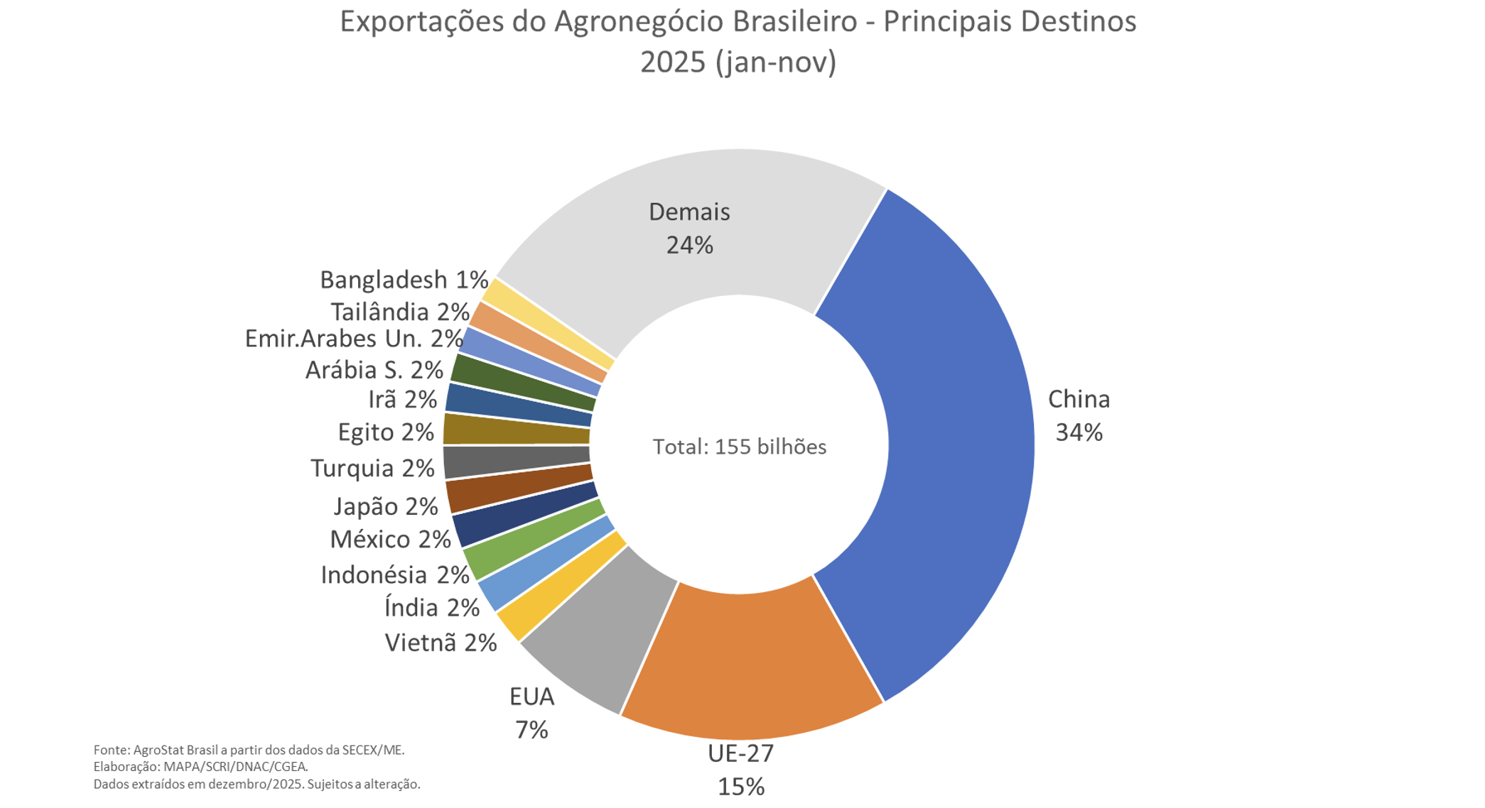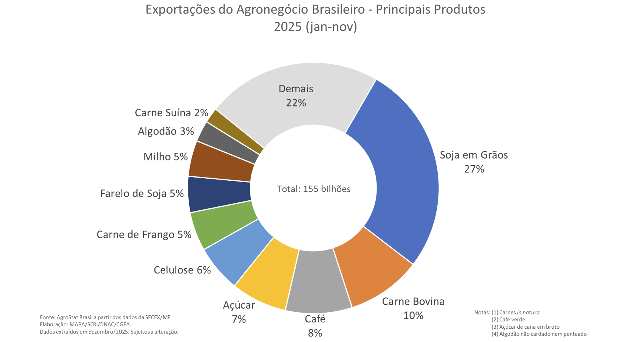 Entre os produtos exportados, seis setores concentraram 81,2% do valor total em novembro de 2025. As carnes lideraram, com US$ 3,0 bilhões. O complexo soja somou US$ 2,4 bilhões. O setor cafeeiro alcançou US$ 1,6 bilhão. Os produtos florestais registraram US$ 1,4 bilhão. O complexo sucroalcooleiro exportou US$ 1,3 bilhão. Cereais, farinhas e preparações totalizaram US$ 1,2 bilhão. Em novembro de 2024, a participação conjunta desses setores havia sido de 79,7%.