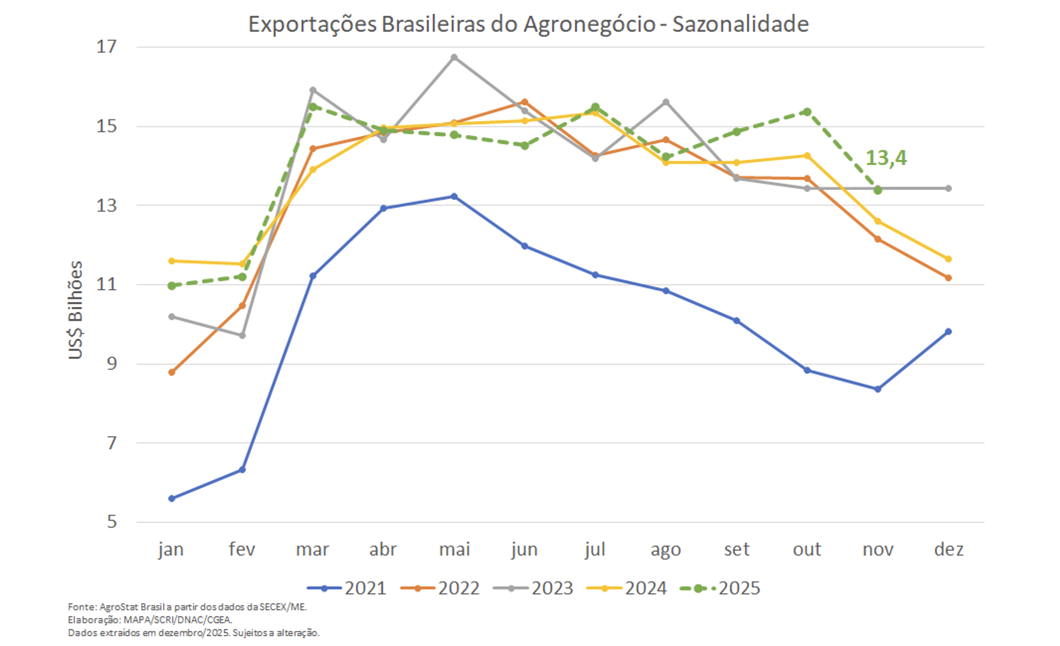 O Brasil registrou US$ 13,4 bilhões em exportações de produtos do agronegócio em novembro de 2025. O valor representou crescimento de 6,2% frente aos US$ 12,6 bilhões exportados em novembro de 2024. O resultado marcou o segundo melhor desempenho da série histórica para o mês, praticamente igual aos US$ 13,44 bilhões registrados em novembro de 2023.