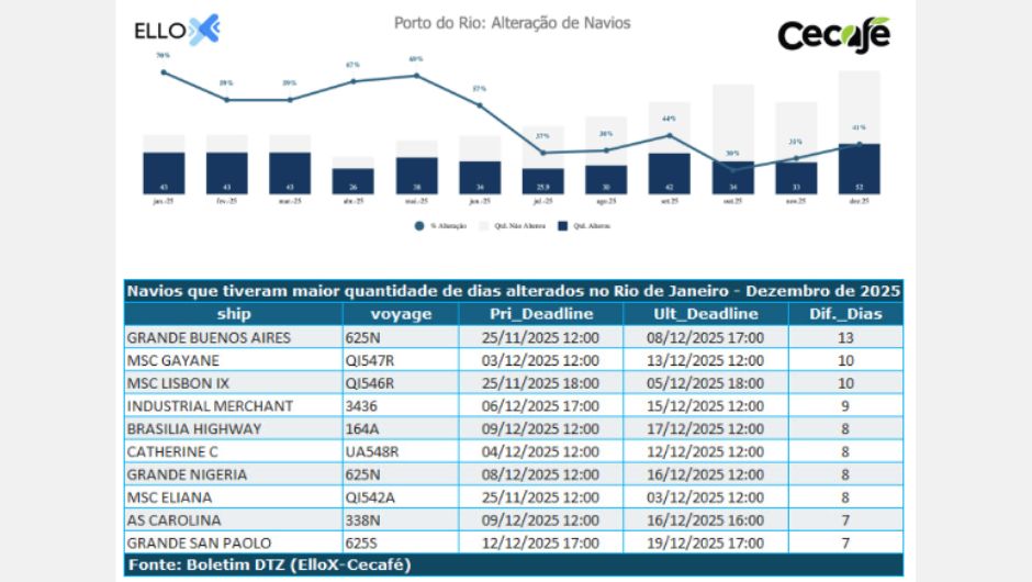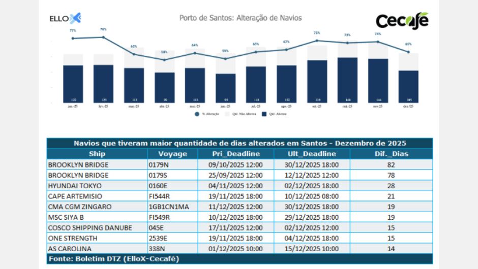 Em dezembro de 2025, 52% dos navios, ou 187 de um total de 361 embarcações, tiveram atrasos ou alteração de escalas nos principais portos do Brasil, conforme o Boletim Detention Zero (DTZ), elaborado pela startup ElloX Digital em parceria com o Cecafé.