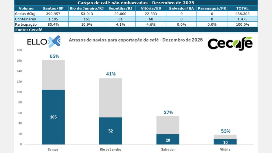O Porto de Santos, que respondeu por 78,7% dos embarques de café entre janeiro e dezembro de 2025, registrou um índice de 65% de atraso ou alteração de escalas de navios, o que envolveu 105 do total de 162 porta-contêineres. O tempo mais longo de espera no mês retrasado foi de 82 dias no embarcadouro santista.