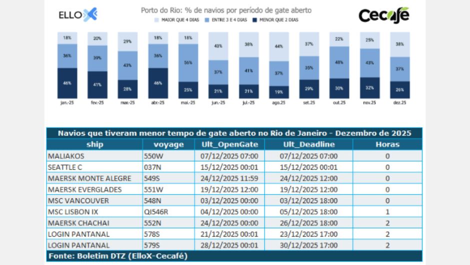 Ainda no último mês de 2025, 38% dos procedimentos de exportação tiveram prazo superior a quatro dias de gate aberto por porta-contêineres nos portos fluminenses; 37% registraram entre três e quatro dias; e 26% possuíram menos de dois dias.
