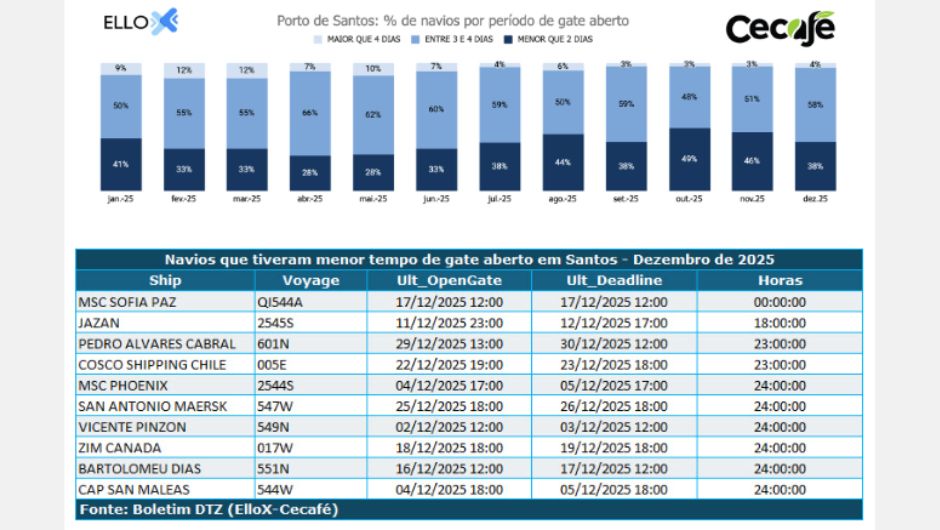 Também em dezembro, somente 4% dos procedimentos de embarque tiveram prazo maior do que quatro dias de gate aberto por navios no porto santista. Outros 58% possuíram entre três e quatro dias e 38% tiveram menos de dois dias.