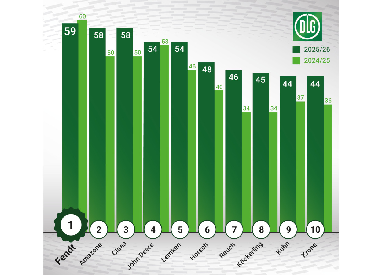 A análise regional também apontou liderança da Fendt. No norte da Alemanha, a marca somou 62 pontos, avanço frente aos 59 registrados na edição anterior. No sul do país, região de origem da empresa, manteve 63 pontos, repetindo o melhor resultado do ano anterior.