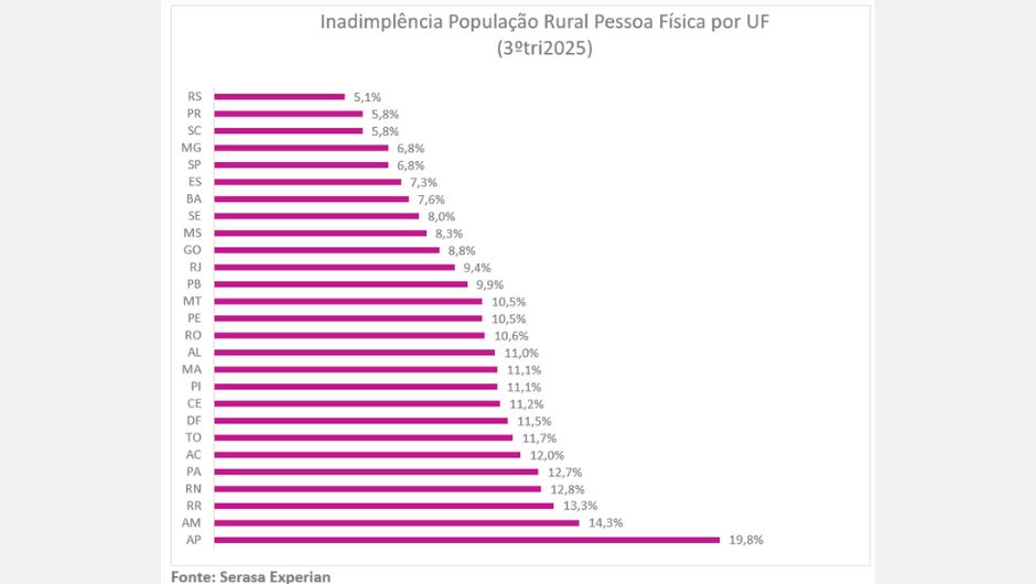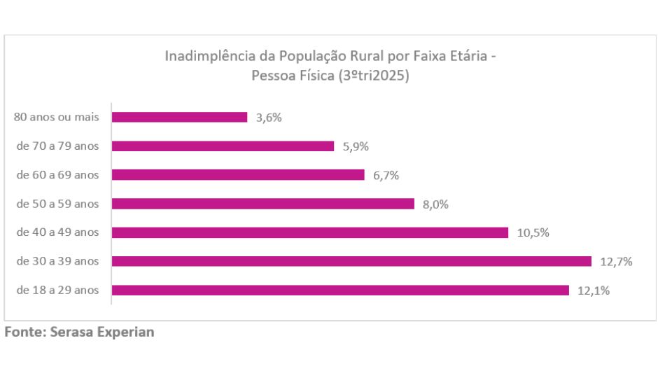 Dados da Serasa Experian indicam que 8,3% da população rural estava inadimplente no terceiro trimestre de 2025. Na comparação com o mesmo período de 2024, a alta foi de 0,9%, enquanto na análise trimestral (2º tri 25 x 3º tri 25), o aumento foi de apenas 0,2%, movimento que indica uma desaceleração para o setor.