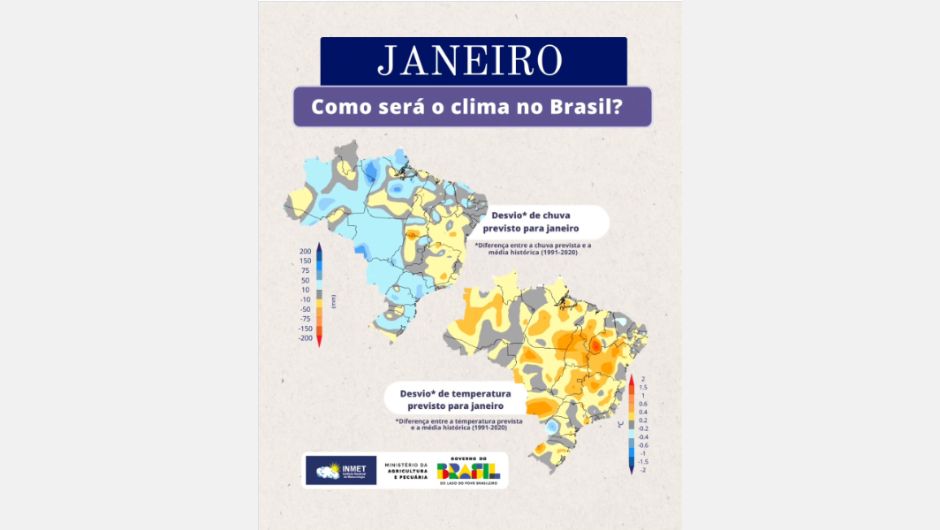 O mês de janeiro de 2026 deverá ser marcado por irregularidade na distribuição das chuvas e temperaturas acima da média em grande parte do Brasil, segundo previsão do Instituto Nacional de Meteorologia (Inmet). Os volumes mais elevados de precipitação devem se concentrar na Região Norte, no oeste do Centro-Oeste e em áreas da Região Sul, enquanto partes do Nordeste, Sudeste e do leste do Centro-Oeste tendem a registrar chuvas abaixo da média climatológica.