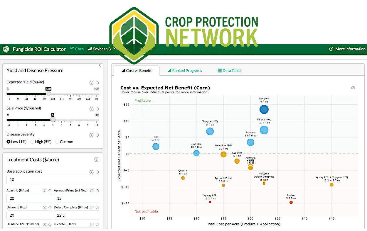 A Crop Protection Network (CPN) disponibilizou uma calculadora de retorno sobre investimento para uso de fungicidas. A ferramenta apoia decisões econômicas em doenças do milho, mofo-branco em soja e doenças foliares em alfafa.