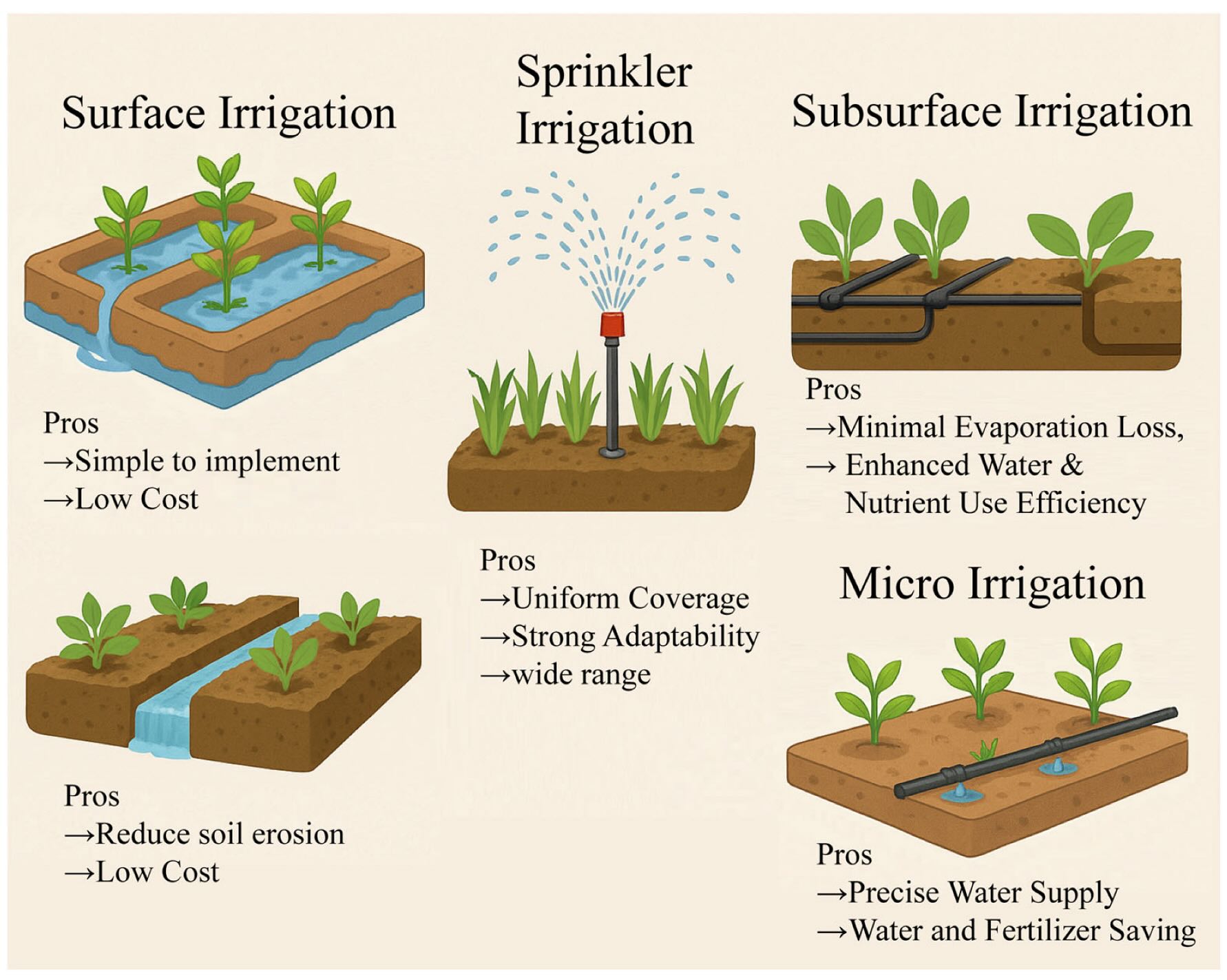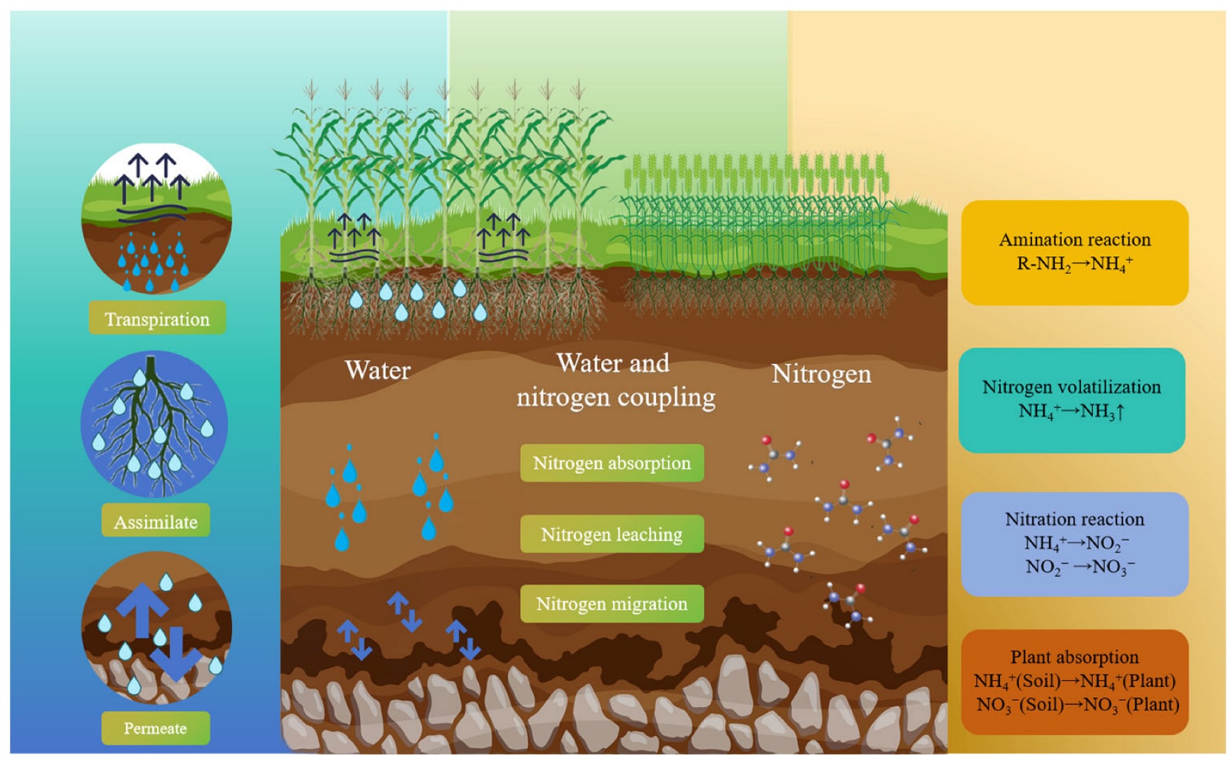 A irrigação influencia diretamente a distribuição da umidade e a mobilidade do nitrogênio no solo. Métodos como irrigação por gotejamento e subterrânea apresentam as maiores eficiências no uso da água e do nitrogênio. Essas técnicas reduzem perdas por evaporação, lixiviação e volatilização. Já métodos tradicionais, como sulco e bordadura, são menos precisos e causam maior risco de perda de nitrogênio.