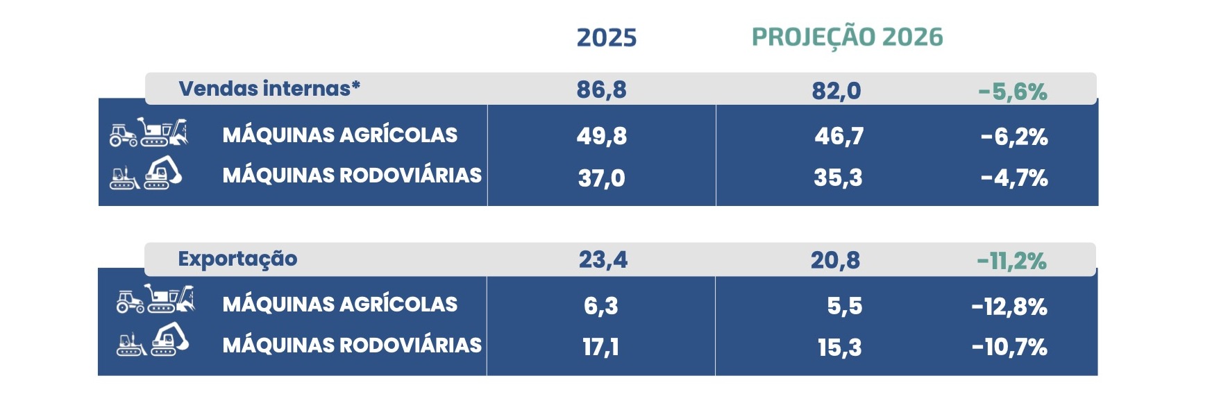 Para 2026, a projeção indica nova queda nas vendas. A retração estimada alcança 6,2%. As exportações também devem recuar 12,8%, após leve alta de 2,4% em 2025.