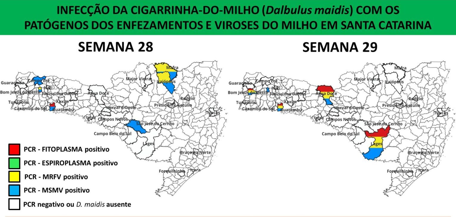 Nas últimas semanas, o monitoramento apontou aumento progressivo da bactéria associada ao fitoplasma do enfezamento-vermelho. Também registrou presença frequente dos vírus do rayado-fino e do mosaico estriado.