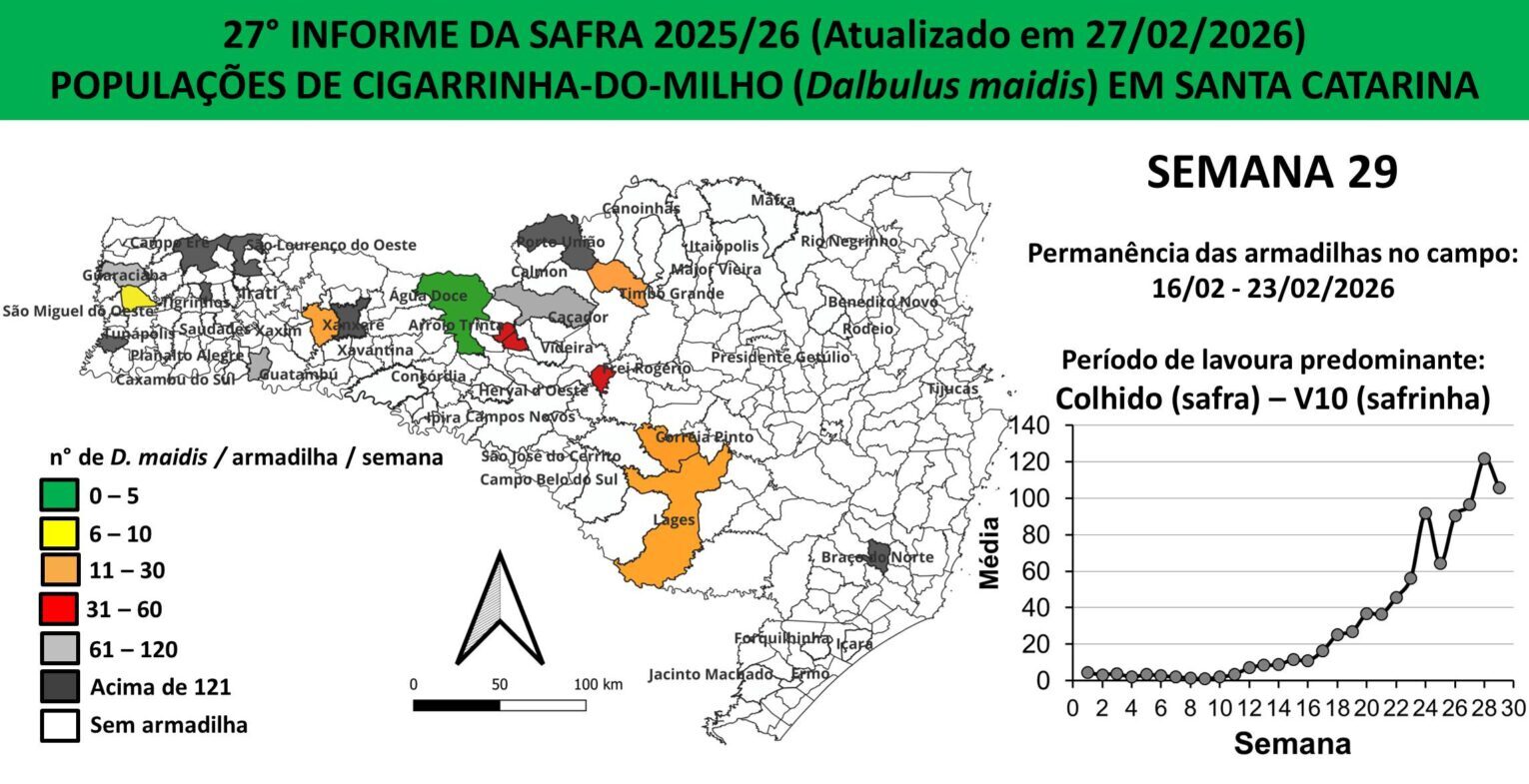 O último levantamento do programa Monitora Milho Santa Catarina registrou forte incidência de cigarrinhas-do-milho no estado. A média estadual alcançou 120 insetos por armadilha.
