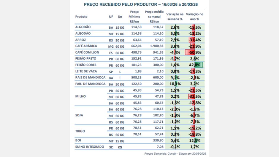 Entre os demais produtos, o etanol tende à estabilidade com leve queda, acompanhando o início da safra; o feijão mantém negociações moderadas; e o milho segue com baixo volume de negócios, influenciado por incertezas climáticas e logísticas.