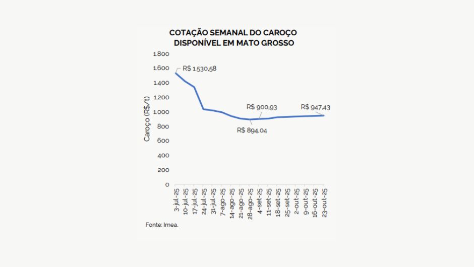 Os preços do caroço de algodão em Mato Grosso vêm registrando recuperação nas últimas semanas, impulsionados pela maior demanda das indústrias por óleo. O Imea aponta que as cotações atingiram R$ 947,43 por tonelada em 23 de outubro, alta de 5,97% em comparação ao fim de agosto, quando o produto era negociado a R$ 894,04/t.