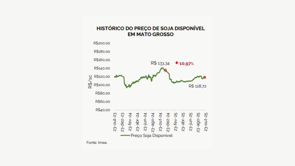 Segundo o Imea, o preço da soja disponível em Mato Grosso encerrou a última semana com média de R$ 118,72 por saca, queda de 10,97% em relação ao mesmo período de 2024. O movimento de baixa é reflexo do recorde de produção no estado e da pressão das cotações na Bolsa de Chicago (CME Group), influenciadas pelas incertezas nas negociações comerciais entre Estados Unidos e China.