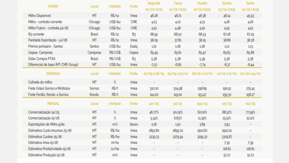 No cenário internacional, o contrato corrente da Bolsa de Chicago registrou valorização de 1,70%, encerrando a semana cotado a US$ 4,24 por bushel. A alta foi sustentada pela maior demanda interna nos Estados Unidos para a produção de etanol e pela demanda firme no mercado externo. Além disso, o atraso na colheita norte-americana — causado pelo excesso de chuvas no cinturão do milho — reduziu a oferta imediata, reforçando o viés de alta.