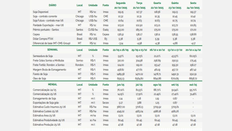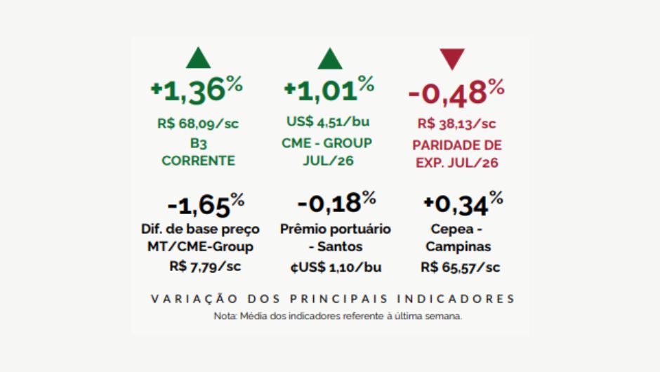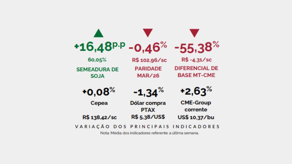 O Imea destaca ainda que os desdobramentos das negociações comerciais entre China e EUA devem continuar influenciando o comportamento das cotações. Um possível acordo entre os países pode elevar os preços em Chicago, mas também redirecionar parte da demanda para o produto norte-americano, o que poderia pressionar os valores da soja mato-grossense nas próximas semanas.