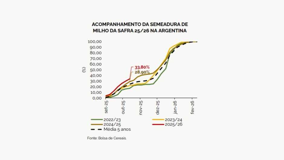 O mercado estadual deve seguir com tendência de firmeza nos preços, sustentado pela demanda doméstica aquecida e oferta restrita. Já no cenário sul-americano, a semeadura do milho 25/26 na Argentina alcançou 33,8% da área prevista, avanço de 4,1 pontos percentuais na semana, com bom ritmo nas regiões centrais, mas desafios de excesso de chuvas em Buenos Aires.