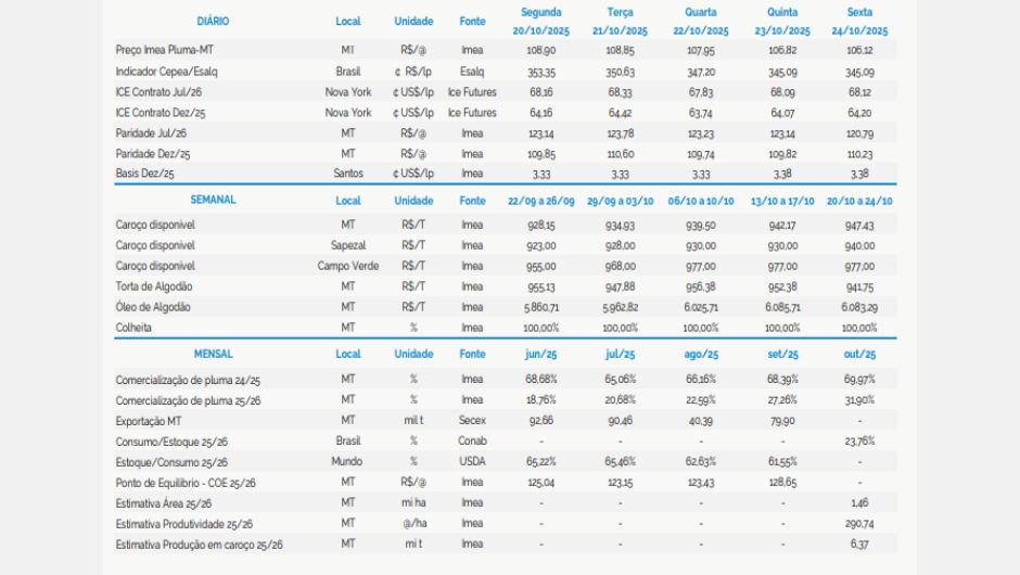 O Imea ressalta que a dinâmica de preços do caroço nas próximas semanas seguirá diretamente ligada ao ritmo de demanda por óleo, que continua sendo o principal fator de sustentação do mercado de algodão em Mato Grosso.