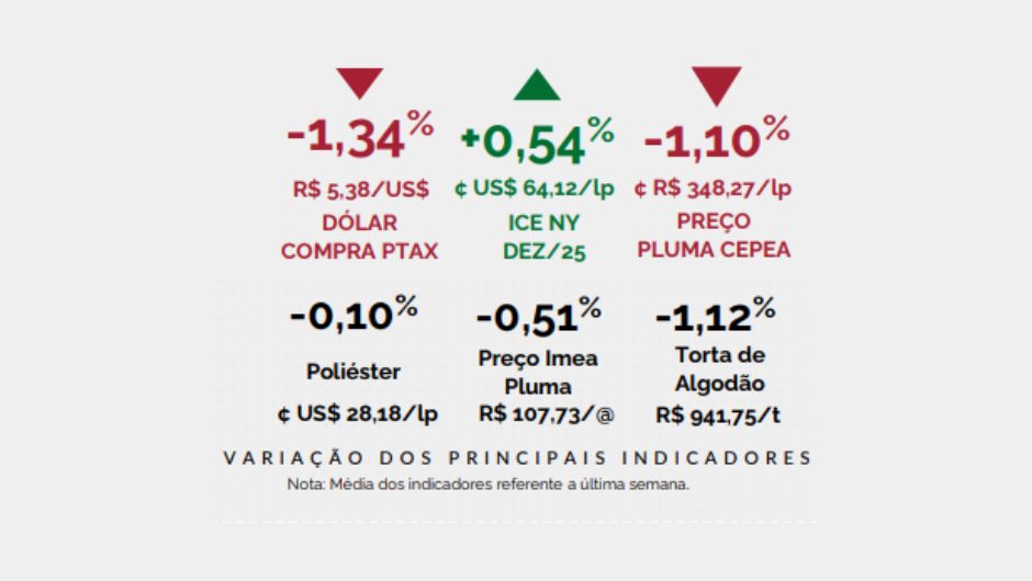 Apesar do cenário de valorização, o preço da pluma apresentou queda de 1,10% na semana, cotado a ¢R$ 348,27 por libra-peso, reflexo da postura mais cautelosa das indústrias nas compras de novos lotes. No mercado internacional, o contrato de dezembro/25 na bolsa de Nova York (ICE) subiu 0,54%, fechando a média em ¢US$ 64,12/lp.