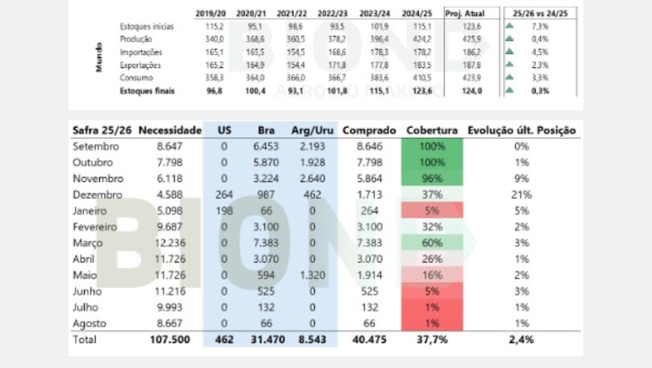 Os Estados Unidos possuem a expectativa de uma uma safra cheia, mas enfrentam lentidão nas exportações, enquanto o Brasil caminha para novo recorde, com produção estimada em 177 milhões de toneladas. Essa abundância mantém os estoques elevados e reduz os prêmios nos portos brasileiros, o que limita novas altas de preço.