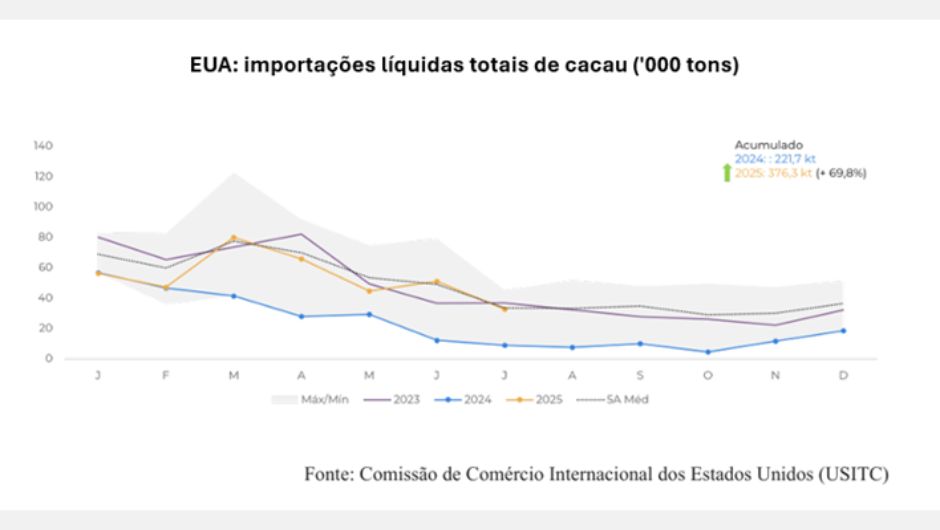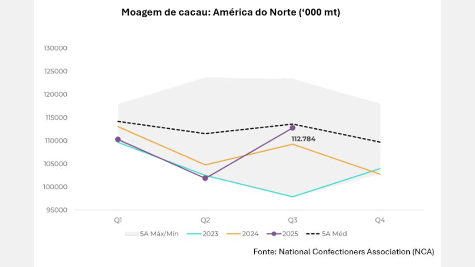 A analista explica que, a National Confectioners Association (NCA), por sua vez, apresentou resultado positivo, com alta de 3,22% em relação ao mesmo período do ano anterior. O avanço foi parcialmente explicado pela inclusão de novos participantes no levantamento, mas também refletiu o aumento expressivo das importações totais líquidas de cacau, que até julho estavam quase 70% acima do mesmo período de 2024.