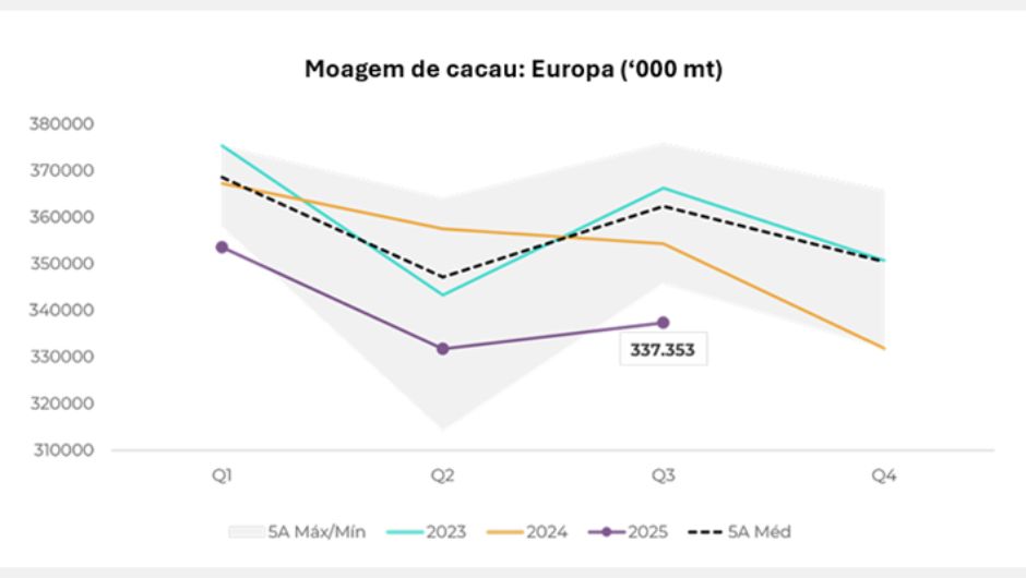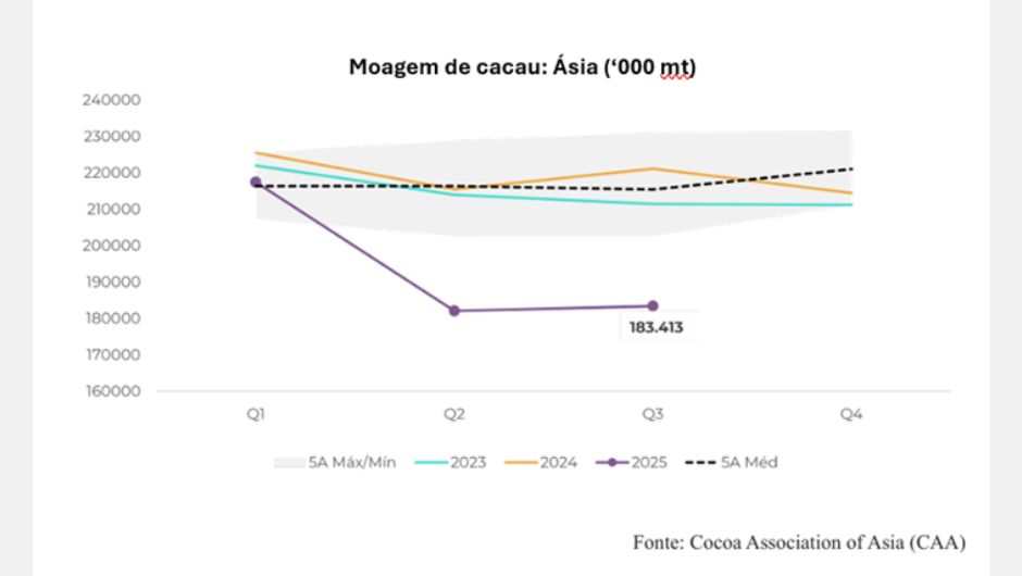 Parte das oscilações mais recentes refletem a divulgação dos dados de moagem referentes ao terceiro trimestre de 2025, principal indicador de desempenho da demanda global. A Cocoa Association of Asia (CAA) e a European Cocoa Association (ECA) reportaram retração na atividade no período em questão. No caso da CAA, a queda foi de 17,08%, influenciada, sobretudo, pela redução significativa observada na Malásia, onde o volume processado ficou 35,1% abaixo do registrado no mesmo trimestre de 2024. Ainda assim, resultados positivos em países como Indonésia e Singapura ajudaram a suavizar a retração regional.
