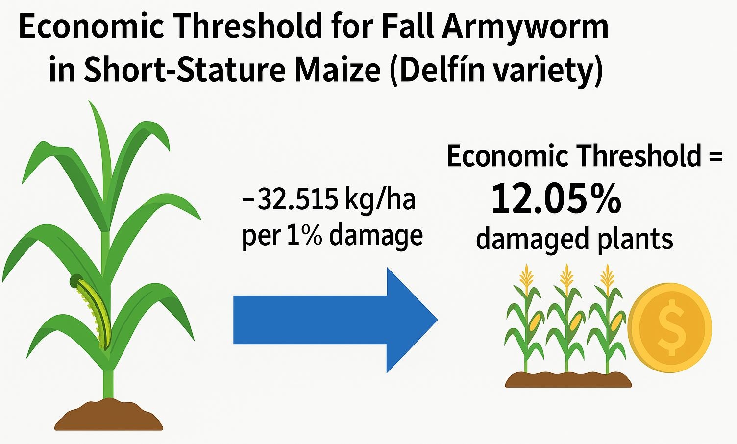 Com base no preço regional do milho, de US$ 325/t, e no custo médio de duas aplicações de inseticida, de US$ 127/ha, os pesquisadores definiram perda econômica equivalente a 391,6 kg/ha. Ao aplicar esse valor na equação linear gerada pelo estudo, o limite econômico foi calculado em 12,05% de plantas danificadas. Acima desse nível, a aplicação de inseticidas compensa o custo do manejo.