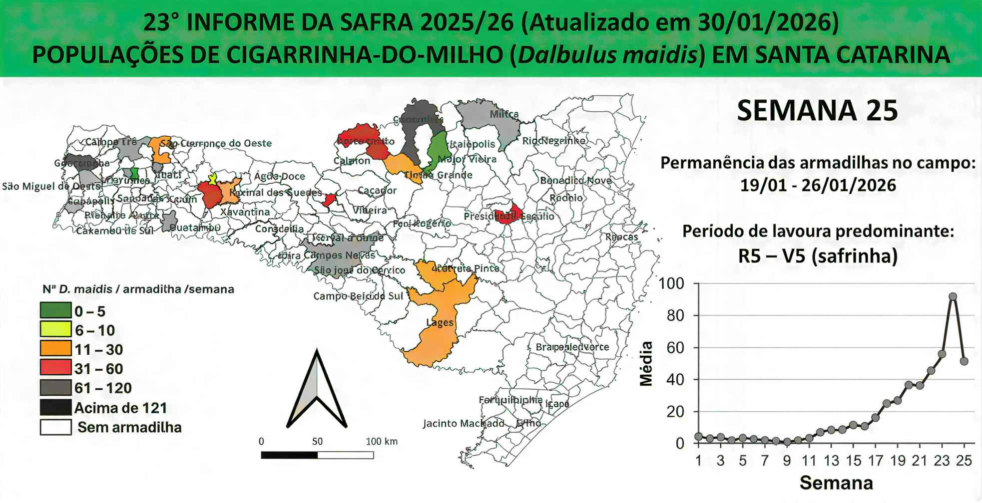 O Programa Monitora Milho SC identificou redução superior a 40% no número de cigarrinhas-do-milho nas lavouras de Santa Catarina. O levantamento ocorreu entre 19 e 26 de janeiro. Os números foram divulgados hoje. A comparação considera a semana anterior. O estado registrou média de 55 insetos por armadilha.