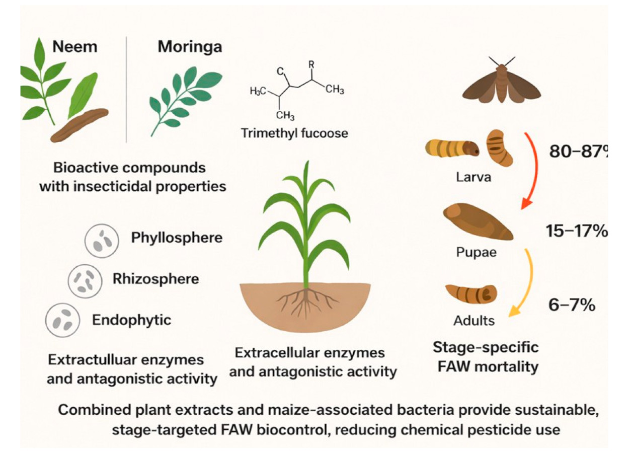 A pesquisa avaliou extratos etanólicos de neem (Azadirachta indica) e moringa (Moringa oleifera) junto com bactérias isoladas de folhas, raízes e colmos do milho. Os testes indicaram melhor desempenho quando o manejo ocorreu nas fases iniciais da infestação.