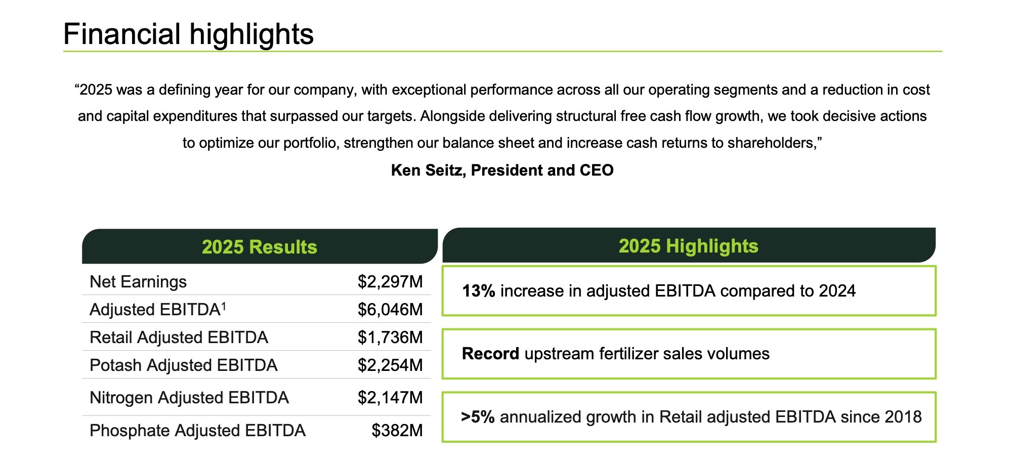 A Nutrien encerrou 2025 com lucro líquido de US$ 2,3 bilhões, alta de 228% frente a 2024. O EBITDA ajustado somou US$ 6,05 bilhões, avanço de 13%. No quarto trimestre, o lucro líquido atingiu US$ 580 milhões, com EBITDA ajustado de US$ 1,28 bilhão.
