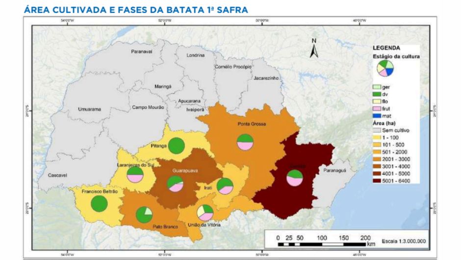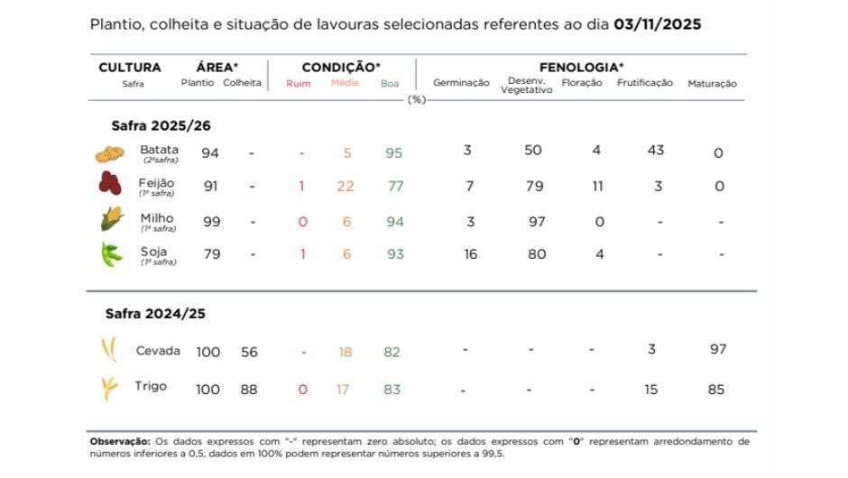 No caso do arroz irrigado, os produtores seguem com os tratos culturais nas áreas já implantadas, aguardando o retorno de condições mais favoráveis para finalizar o plantio nas áreas restantes. As lavouras de batata, por sua vez, têm se beneficiado das precipitações moderadas, que vêm favorecendo o crescimento e o enchimento dos tubérculos.