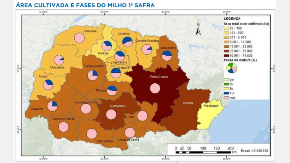 As lavouras de milho 1ª safra encontram-se, majoritariamente, nas fases finais de enchimento de grãos e maturação. Segundo o Deral, o aspecto geral é considerado bom. Em algumas áreas, o ciclo foi alongado em função das condições climáticas, o que postergou o início da colheita. Ainda assim, onde as operações se aproximam, as perspectivas são positivas.