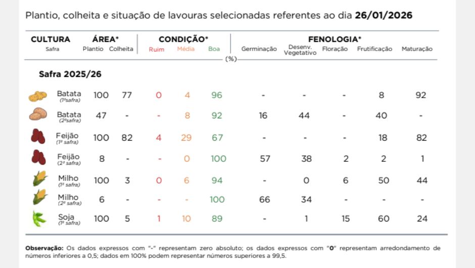 Há registros de ferrugem-asiática em áreas monitoradas, o que reforça a necessidade de manejo criterioso da doença. A colheita da soja ocorre de forma pontual e tende a ganhar ritmo nas próximas semanas, período em que também se intensificam o planejamento e a implantação das culturas de 2ª safra.