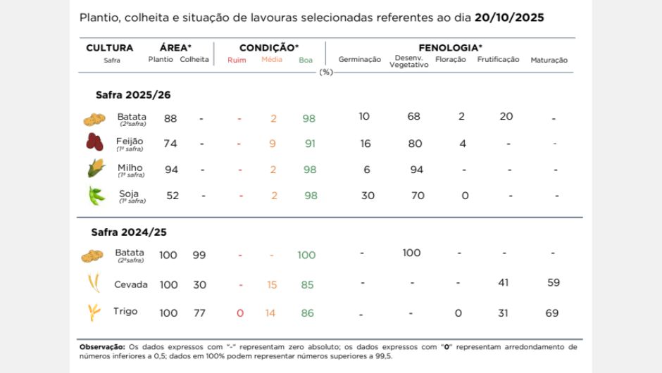 Nos bananais, ventos fortes registrados em alguns municípios causaram danos pontuais, mas as áreas afetadas estão em recuperação. O feijão, por sua vez, encontra-se em diferentes estágios de implantação: nas regiões mais chuvosas, há relatos de alagamentos e danos radiculares, enquanto em áreas de clima mais estável os plantios avançam bem.