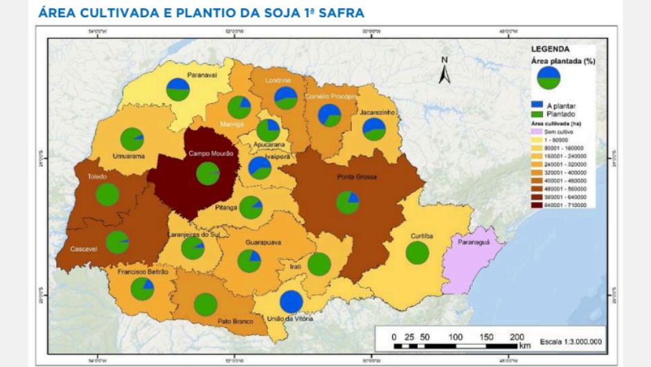 O mais recente boletim do Departamento de Economia Rural (Deral), referente ao período de 14 a 20 de outubro, indica avanço no plantio da soja em praticamente todas as regiões do Paraná, ainda que com interrupções pontuais devido ao excesso de chuvas e à elevada umidade do solo. Nas áreas já implantadas, o desenvolvimento inicial das lavouras é considerado bom, com regularização após as precipitações recentes. O monitoramento fitossanitário está em andamento, e produtores iniciam aplicações preventivas nas áreas mais adiantadas.