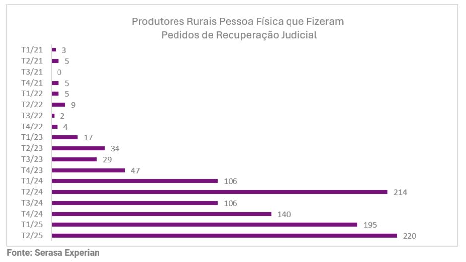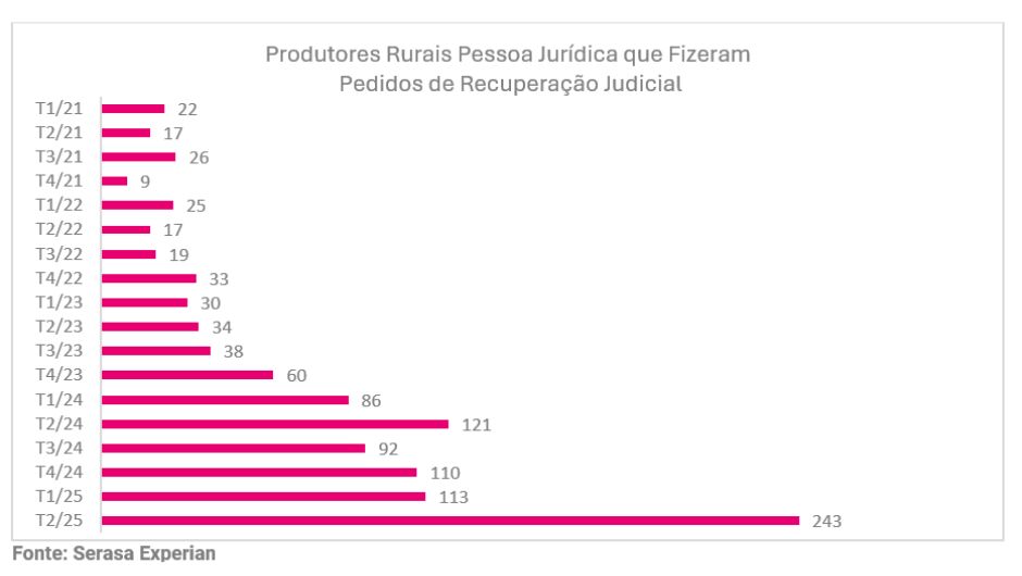 Entre abril e junho, produtores rurais com CNPJ registraram 243 solicitações de recuperação judicial, praticamente o dobro do mesmo período de 2024 (121). O cultivo de soja respondeu pela maior parte dos pedidos (192), seguido pela pecuária bovina (26).