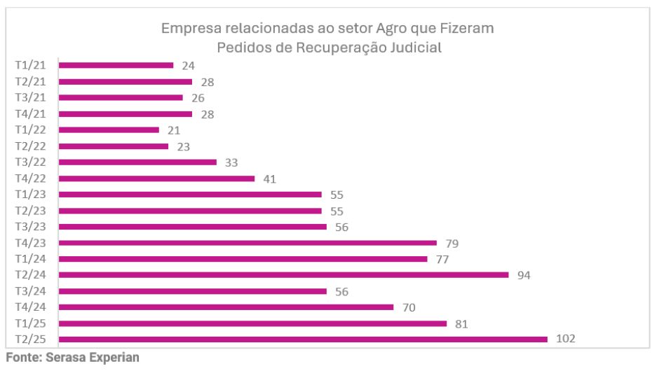 As empresas ligadas ao setor agropecuário apresentaram 102 pedidos, maior volume da série recente e acima dos 94 observados no segundo trimestre de 2024. A indústria de processamento de derivados agrícolas, como óleo de soja, açúcar, etanol e laticínios, liderou a estatística, com 32 solicitações.