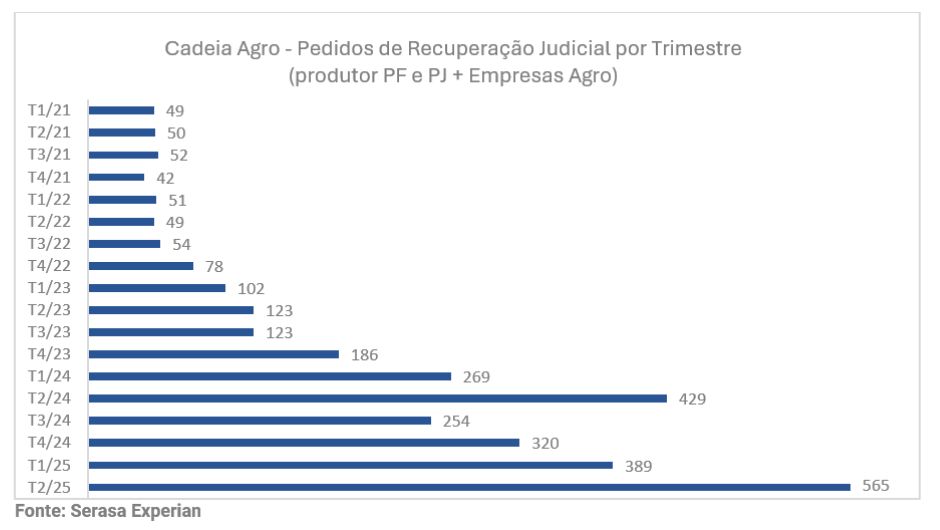 O agronegócio brasileiro registrou 565 pedidos de recuperação judicial no segundo trimestre de 2025, um aumento de 31,7% em relação ao mesmo período do ano passado (429 solicitações). Os dados fazem parte do Indicador de Recuperação Judicial Agro, da Serasa Experian.