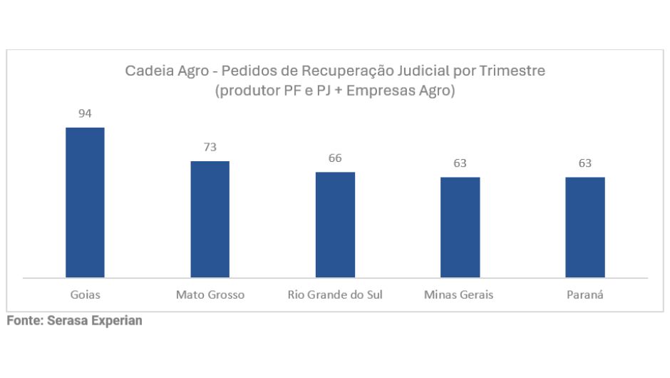 Cinco estados se destacaram pela concentração de pedidos de recuperação judicial no agronegócio: Goiás (94), Mato Grosso (73), Rio Grande do Sul (66), Minas Gerais (63) e Paraná (63).