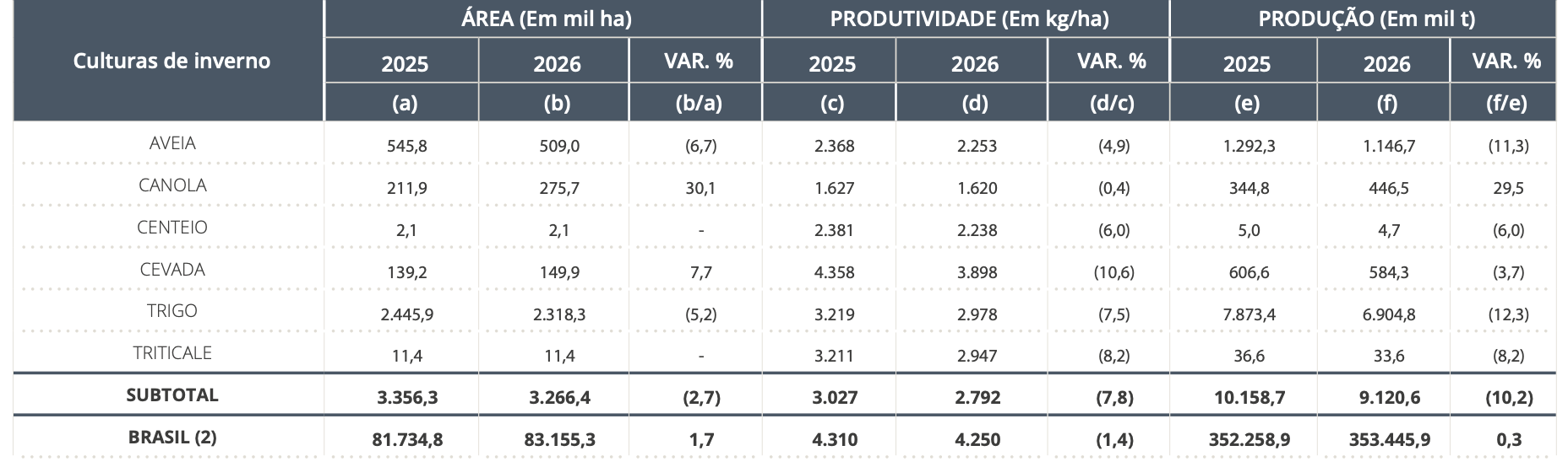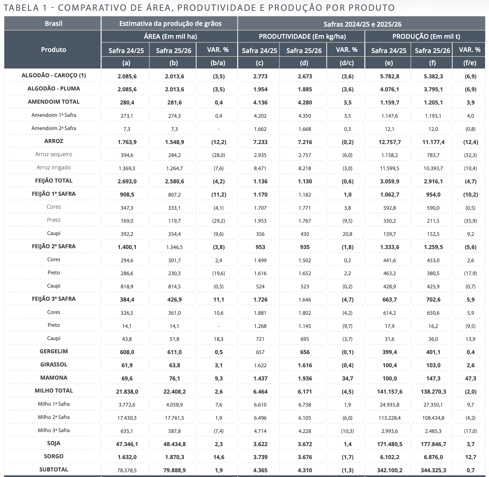 A área cultivada também apresenta expansão. A estimativa é de 83,2 milhões de hectares, avanço de 1,7% na comparação com o ciclo anterior, o que corresponde à incorporação de aproximadamente 1,4 milhão de hectares ao sistema produtivo.