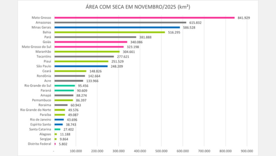 Considerando a área absoluta sob influência da seca, Mato Grosso liderou o ranking em novembro, seguido por Amazonas, Minas Gerais, Bahia e Pará. No total, a área atingida no país somou cerca de 5,7 milhões de quilômetros quadrados, o equivalente a mais de dois terços do território brasileiro.