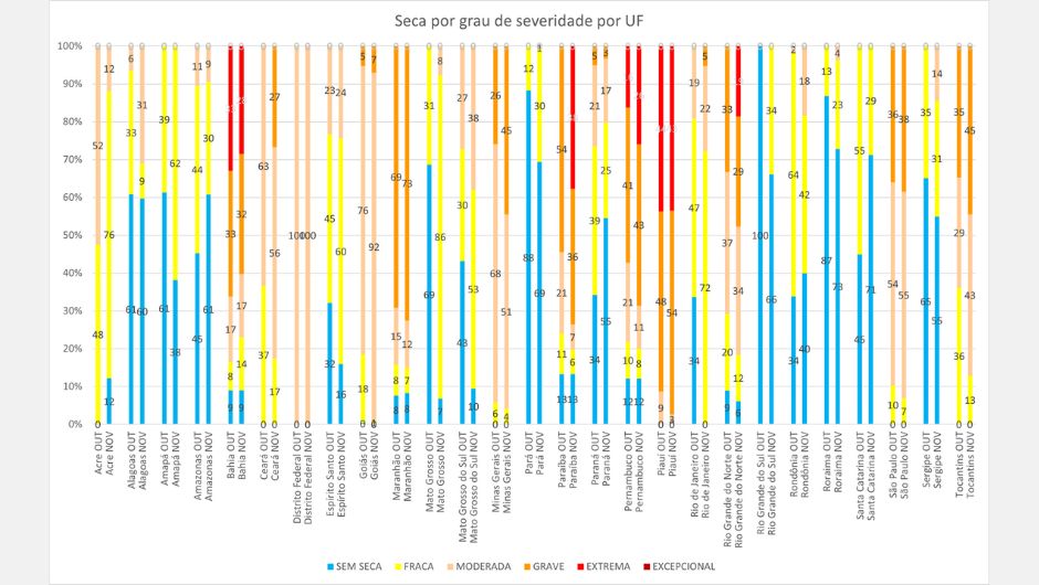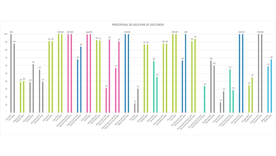 Em novembro, oito estados apresentaram seca em 100% de seus territórios: Ceará, Distrito Federal, Goiás, Minas Gerais, Piauí, Rio de Janeiro, São Paulo e Tocantins. Nos demais estados com ocorrência do fenômeno, os percentuais de área afetada variaram entre 27% e 94%.