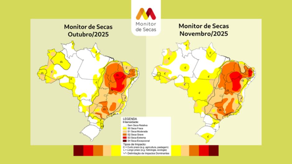 Em termos de intensidade, houve redução da severidade da seca em quatro estados no período: Acre, Amazonas, Bahia e Paraná. Por outro lado, o agravamento do fenômeno foi registrado em 19 unidades da Federação, entre elas Goiás, Mato Grosso, Mato Grosso do Sul, Minas Gerais, São Paulo, Rio de Janeiro e diversos estados do Nordeste. A condição permaneceu estável em Amapá, Distrito Federal e Santa Catarina. No Rio Grande do Sul, a seca voltou a ser observada em novembro, após ausência no mês anterior.