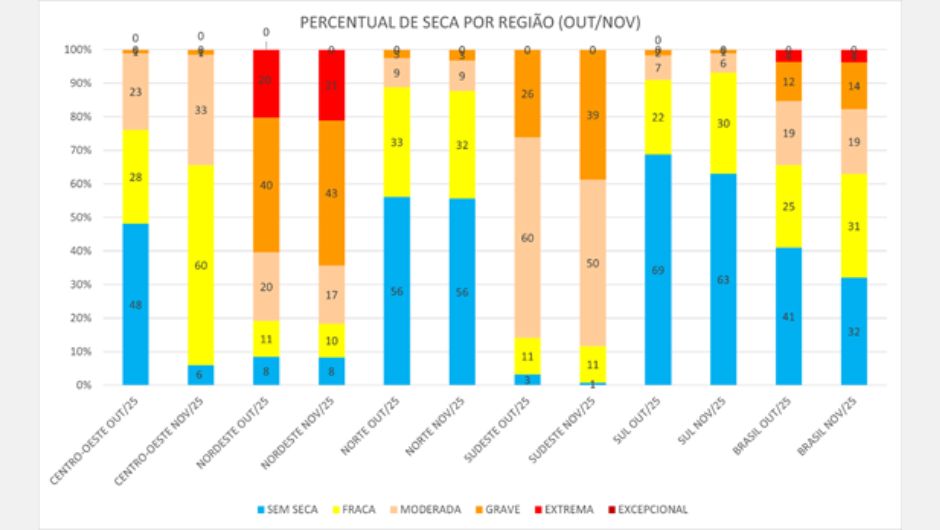 Entre as regiões acompanhadas pelo Monitor, o Sul apresentou o quadro mais brando em novembro. Já o Nordeste concentrou a situação mais crítica, com 21% de sua área sob seca extrema — o pior registro regional desde março de 2019. No comparativo mensal, a severidade da seca aumentou no Centro-Oeste, Nordeste e Sudeste, diminuiu no Sul e permaneceu estável no Norte.