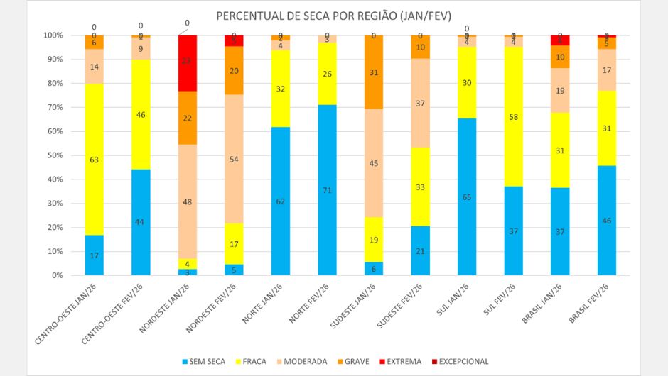 Entre as regiões, o Nordeste apresentou o quadro mais severo do país, sendo a única a registrar seca extrema e com 95% de sua área afetada. Já o Norte teve a condição mais branda, com apenas 29% do território com registro do fenômeno.