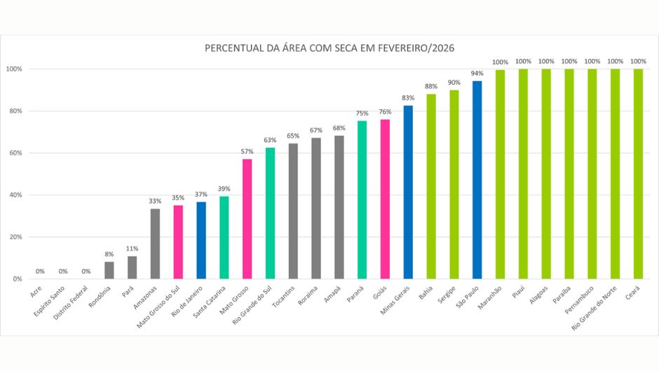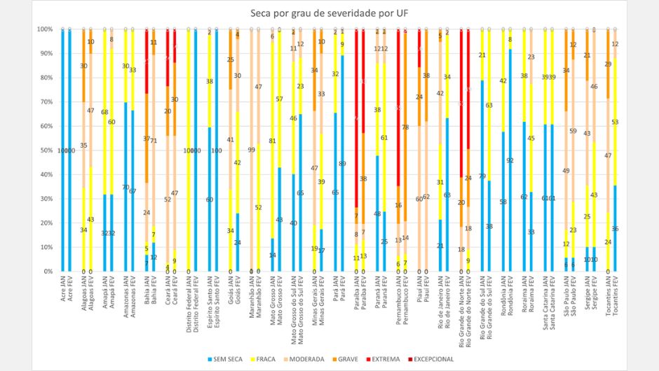 Sete estados tiveram 100% do território com registro de seca em fevereiro: Alagoas, Ceará, Maranhão, Paraíba, Pernambuco, Piauí e Rio Grande do Norte. Nos demais, os índices variaram entre 8% e 94%.