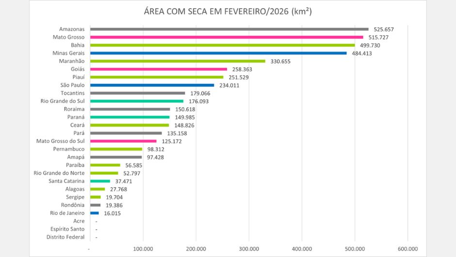 Na comparação mensal, quatro estados ampliaram a área afetada pela seca: Amazonas, Paraná, Rio Grande do Sul e Roraima. Em contrapartida, houve redução em nove estados, entre eles Bahia, Mato Grosso, Minas Gerais e Tocantins.