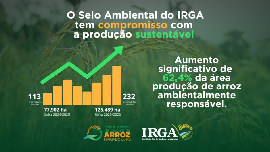 Com o compromisso de fomentar a produção sustentável de arroz, alinhada às legislações vigentes e às boas práticas de manejo que asseguram qualidade de vida aos envolvidos na cadeia orizícola, o Selo Ambiental da Lavoura de Arroz Irrigado do Rio Grande do Sul, promovido pelo Instituto Rio Grandense do Arroz (Irga), tem impulsionado a expansão das áreas de cultivo ambientalmente responsável.